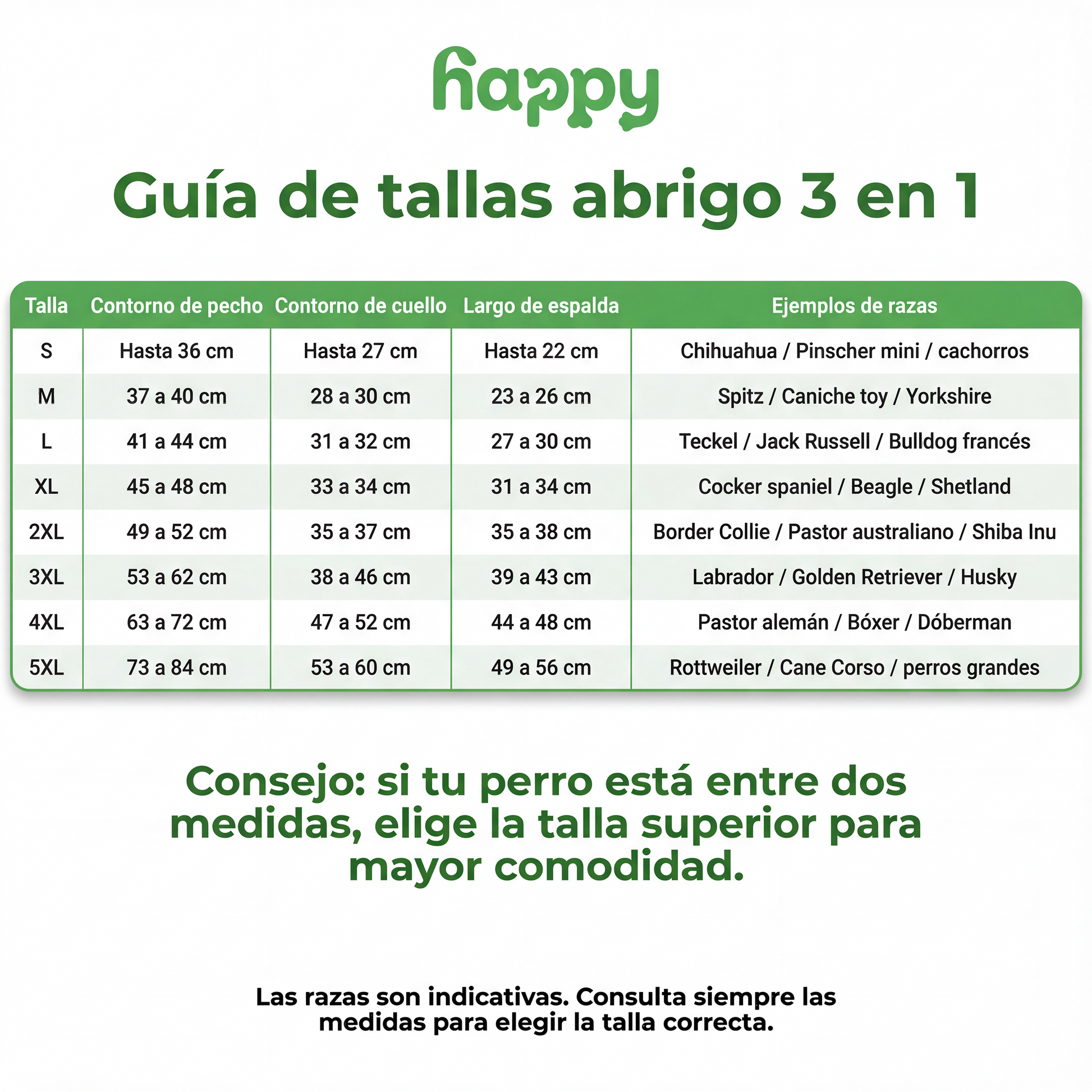 Mide el largo de la espalda (desde el cuello hasta la base de la cola) y la circunferencia del pecho.