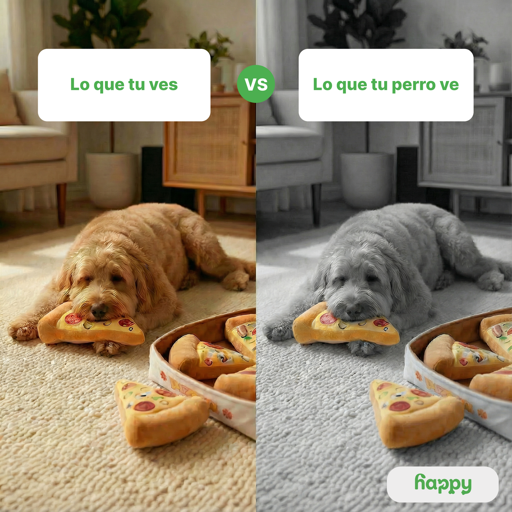 La Pizza Antiestrés fue diseñada específicamente para tener en cuenta estas diferencias. Gracias a un color que los perros distinguen con especial facilidad, tu compañero lo ve fácilmente. Esto hace que el juego no solo sea más entretenido, sino que también promueve la estimulación mental.