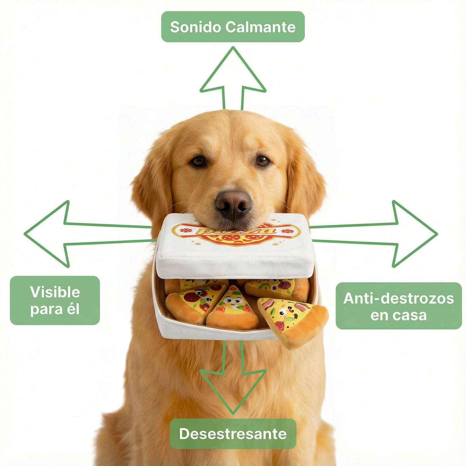 No. La Pizza antiestrés emite un sonido suave y controlado, diseñado para estimular a tu perro sin resultar molesto para las personas. No es estridente ni continuo, y solo suena cuando el perro lo muerde o aprieta, por lo que no interfiere con el descanso ni con la tranquilidad del hogar.